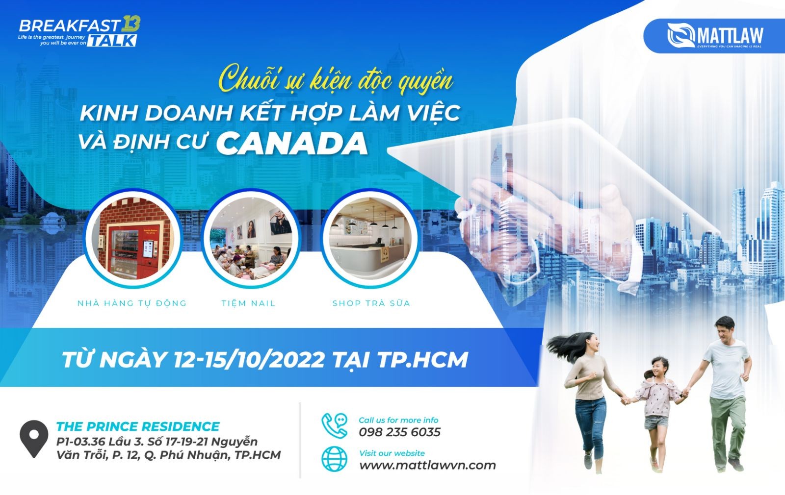 Trong khuôn khổ chuỗi sự kiện giới thiệu sản phẩm độc quyền có tên gọi: “Kinh doanh kết hợp làm việc và định cư Canada” được tổ chức từ ngày 12-15/10/2022 tại Thành phố Hồ Chí Minh, MattLaw trân trọng kính mời quý anh chị và công ty đến tham dự và gặp gỡ trực tiếp đối tác RCIC và Chuyên gia Tư vấn Quản lý Kinh doanh tại Canada của MattLaw.